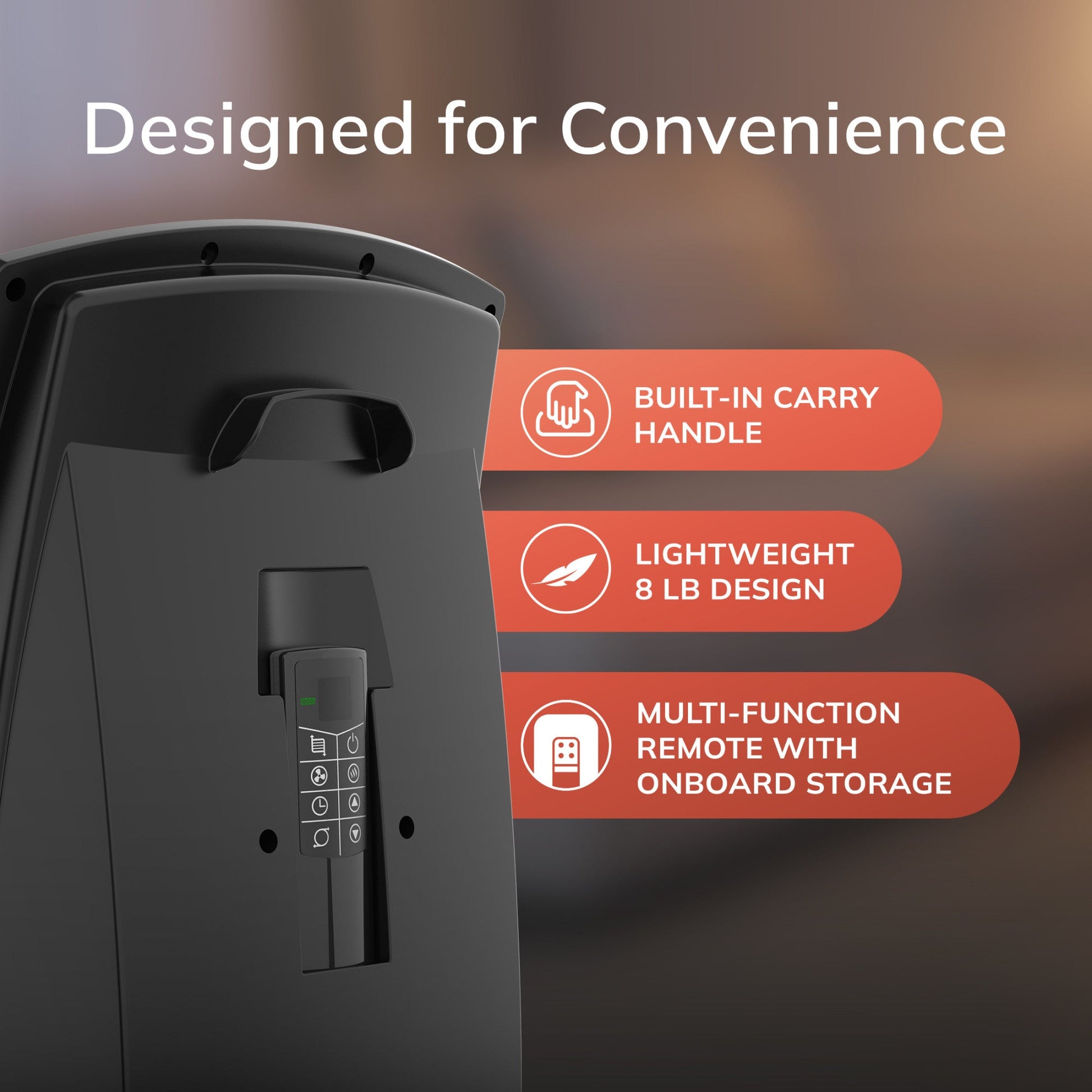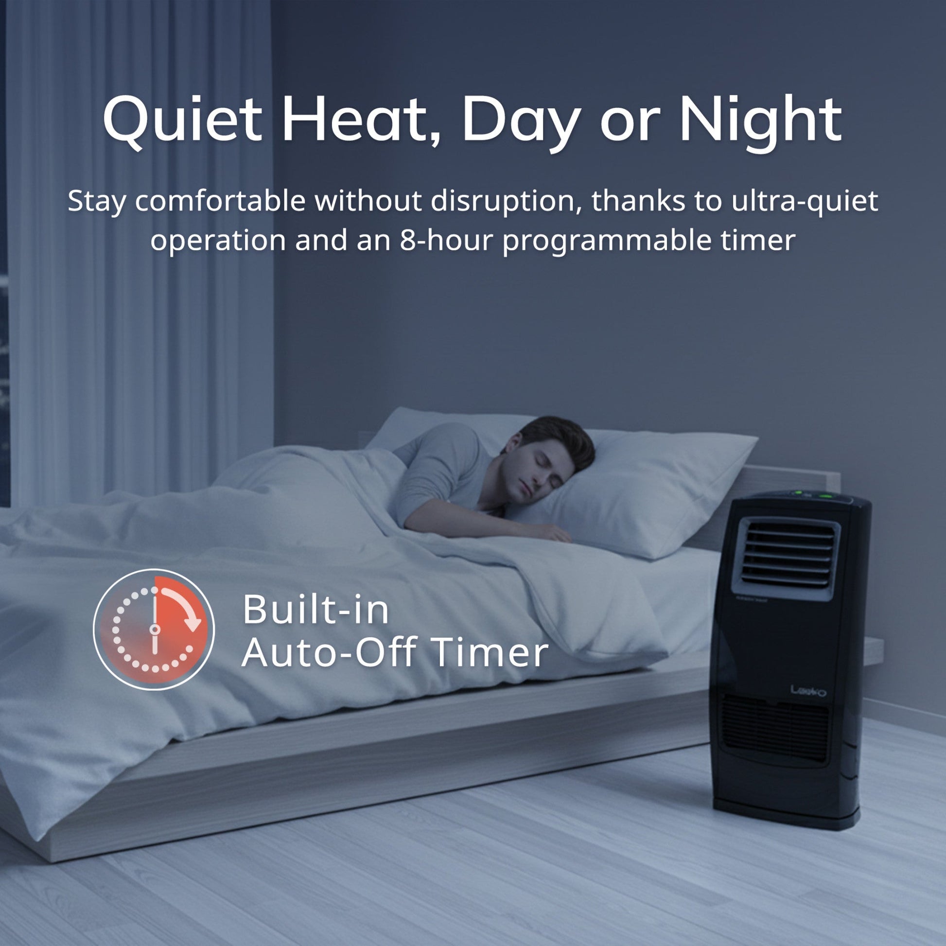 The Elite Collection Motion Heat Plus is a whole room ceramic heater that provides four-way heat circulation throughout your room. Widespread oscillation and powered louvers combine to provide heat in wide-sweeping waves of warmth and comfort from floor to ceiling. This sleek space heater features 3 heat settings, plus a fan-only mode and an auto shut-off timer mode, which is programmable up to 8 hours. The heater's AutoEco thermostat automatically maintains the heat level in your room to help maintain comfort using less energy. The heater functions are easy to operate using the simple on-board controls or the multi-function remote.