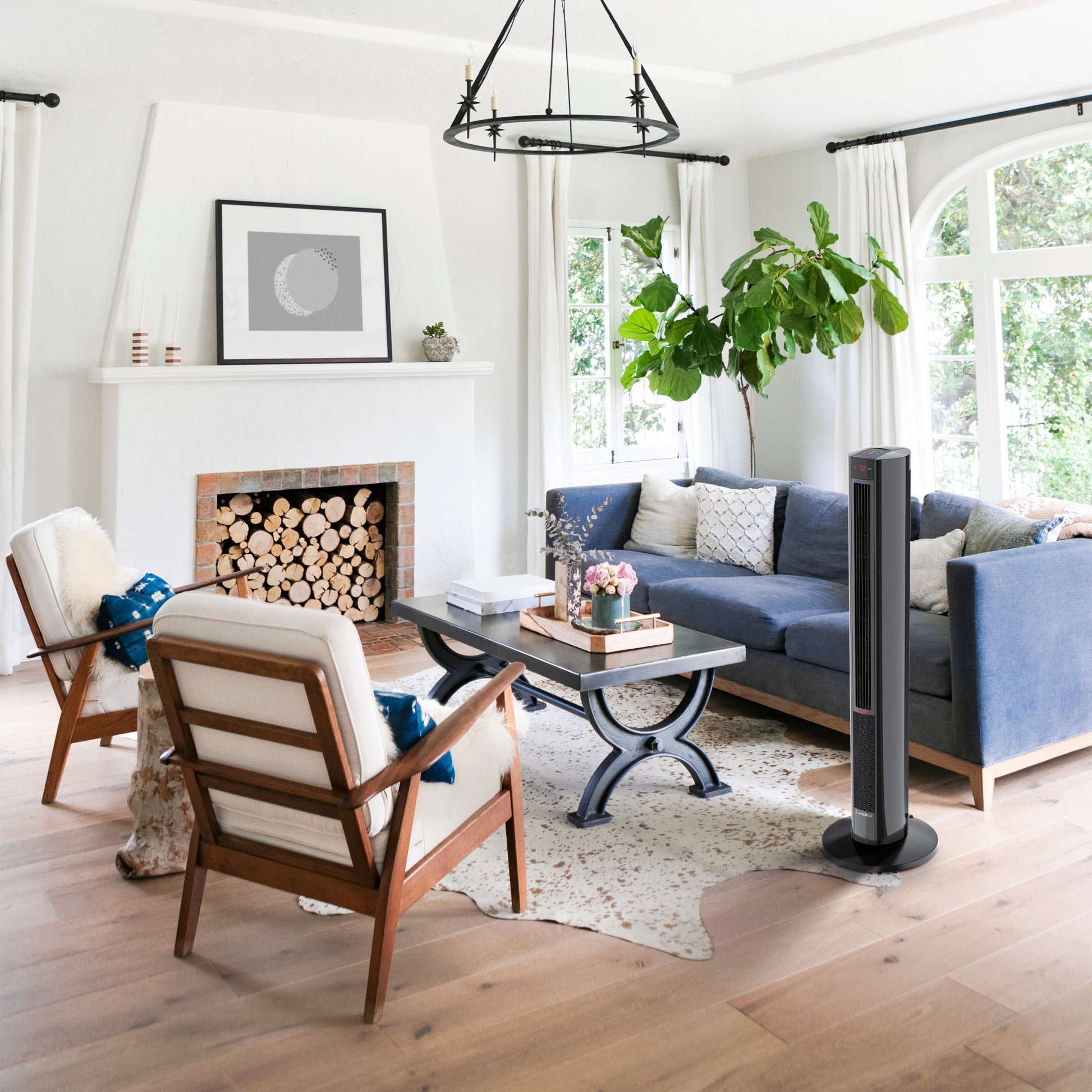 All Season Comfort Control Tower Fan & Space Heater in One by Lasko® is the ideal solution to provide year-round comfort. The top half of this slim, hybrid model is a high-reaching fan, which creates a cooling breeze with 4 quiet speeds (high, medium, low, and extra low). The lower half produces a soothing warmth with a choice of 3 heat settings (high, medium, and low). Additionally, the high heat with fan booster mode simultaneously activates high heat and super low fan. The Auto Eco adjustable thermostat allows you to maintain comfort while using less energy. Safety features include automatic overheat protection and cool-touch housing. Program the timer mode to run from 1 to 8 hours, then automatically turn off for convenience and peace of mind. Comes with a multi-function, digital remote control. This combination fan and space heater unit is all about simplicity, with easy no-tool assembly, easy-to-clean filter and built-in carry handle for transport from room-to-room. Plus, an on-board remote control storage for added convenience. Includes 3-year limited warranty.