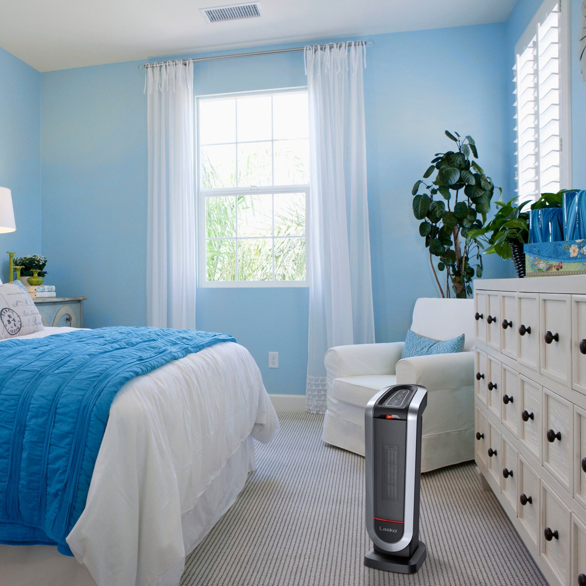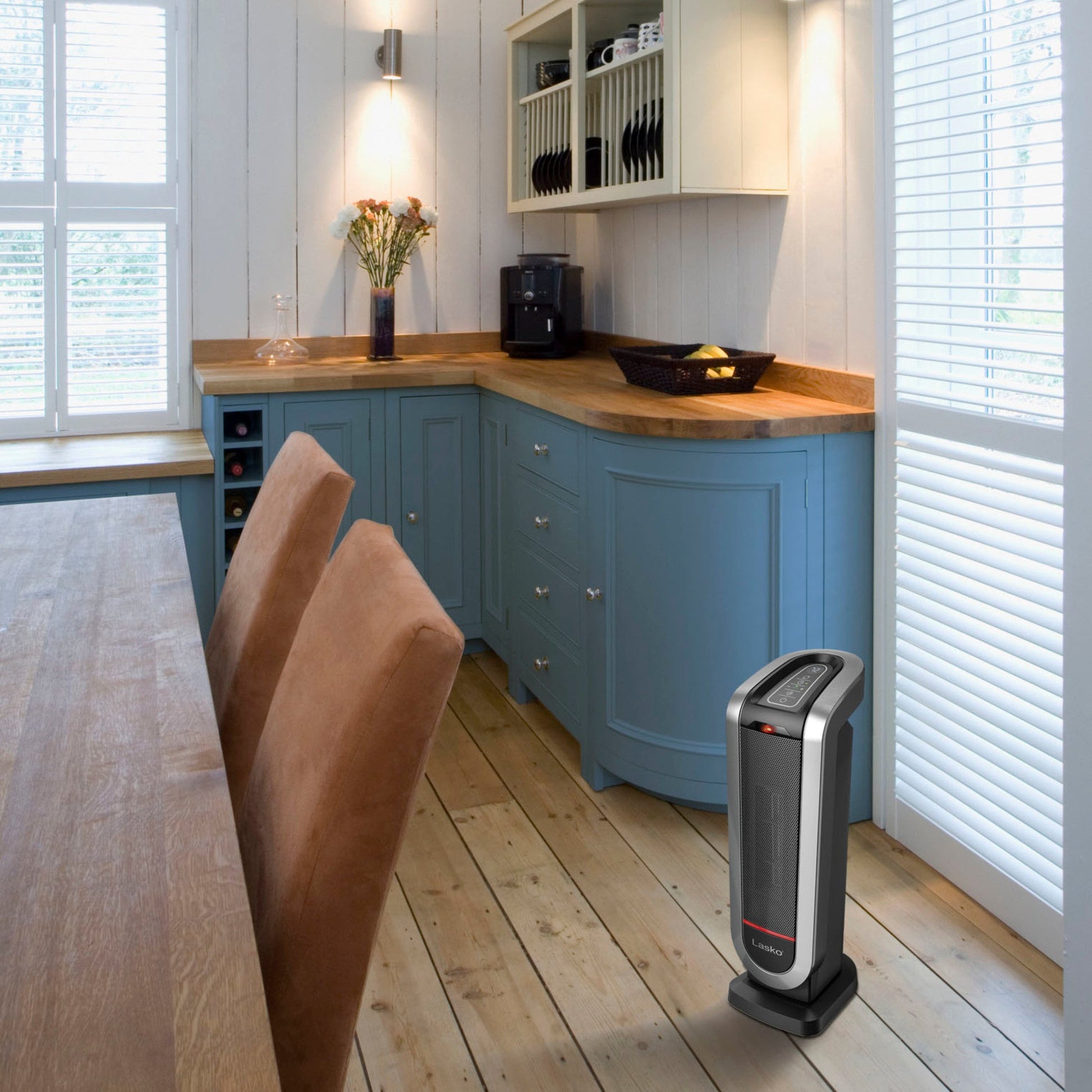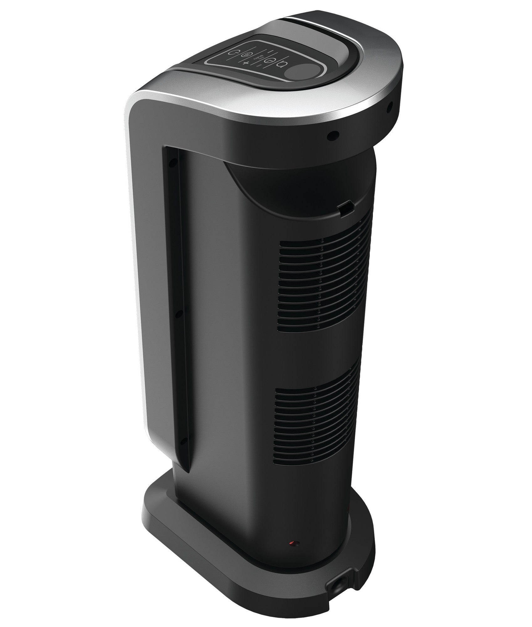Warm-up with this Ceramic Tower Heater with Remote Control by Lasko. Attractive, yet performance packed, this heater will release 1500 watts of comforting heat throughout any room or home office. Featuring, AutoEco, an automatic electronic thermostat that disperses soothing warmth while using less energy. Choose from 3 heat settings (high heat with high fan speed, high heat with low fan speed, and low heat with low fan speed) and optional oscillation to evenly disperse warmth. Built-in safety features, include a ceramic heating element, overheat protection, cool-touch housing, and a tip-over safety switch. Comes fully assembled with an easy-grip handle and on-board remote storage for added convenience. 3 year limited warranty.