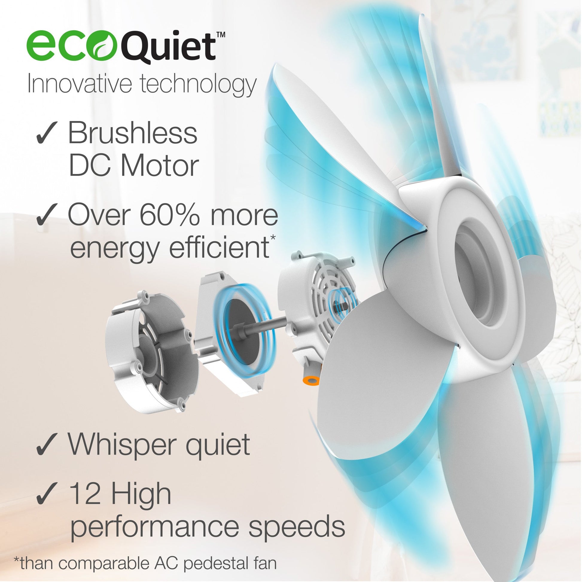 Enjoy a refreshing breeze with the 18¡± Eco Quiet DC Motor Pedestal Fan with Remote Control from Lasko. This is DC stand fan is over 60% more energy efficient than comparable AC tower fans. With whisper quiet operation, the New EcoQuiet fan is ideal for use in the bedroom, home office and main living areas or wherever you need air circulation. The quiet operation allows you to enjoy TV and provides white noise to lull you to sleep. This powerful pedestal fan features easy to use electronic controls with a digital display. Choose from 12 high performance speeds: 4 Turbo modes, 4 Breeze modes and 4 Whisper modes. Use the timer option to automatically turn the fan off after the selected time. Widespread oscillation evenly disperses a refreshing breeze throughout the room. The adjustable height and tilt-back fan head allow you to direct the airflow where you need it most. The multi-function remote control operates all the fan function from a distance. Plus, there is storage for the remote on the back of the fan. The built-in carry handle makes it easy to move from room to room. Requires simple, no-tools assembly and comes with a 2-year limited warranty.