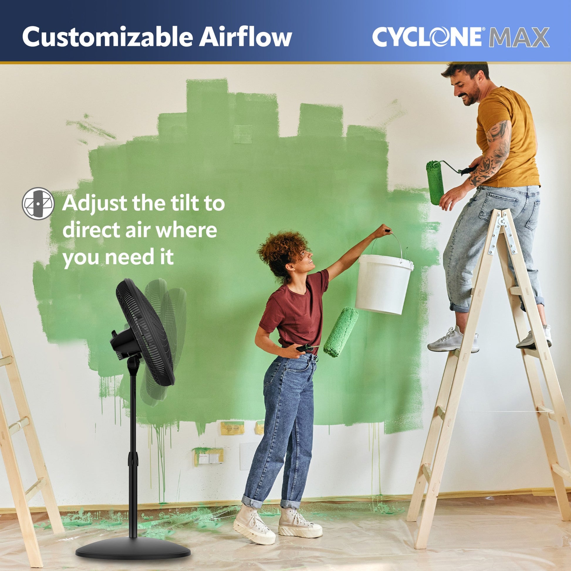Experience cooling and comfort with the Lasko Cyclone? Max 4-Speed Remote Control Pedestal Fan with 18-inch fan blade. This floor fan features a metal grille that ensures durability and also operates quietly. The 18" high-velocity blade moves air at a speed of up to 1,378 feet per minute, providing a powerful breeze that cools any room. This pedestal fan circulates air up to 19 times an hour in extra-large rooms and 38 times an hour in larger spaces, making it an ideal addition to bedrooms, dining rooms, basements, offices, and kitchens. Unlike conventional tower fans, this Cyclone? Max covers up to 4.3 times more space, ensuring air distribution throughout your room. Features customizable height settings, allowing you to modify the fan's height from 41 inches to 53 inches for tailored airflow direction. The widespread oscillation feature ensures complete room coverage, while the tilt-back fan head enables precise adjustments of airflow up or down to suit your preference. Manage your cooling experience with electronic controls offering 4 high-performance speeds. Enjoy the convenience of the multi-function remote control, granting you the power to operate the fan from a distance, adjusting speeds or turning it on/off with ease. Setting up your Cyclone? Max stand fan is a breeze with its tool-free assembly. Safety is paramount, and with the trusted Blue Plug technology, this fan prioritizes your well-being by promptly responding to short circuits, ensuring a secure user experience. This fan also comes with a 1-year limited warranty.