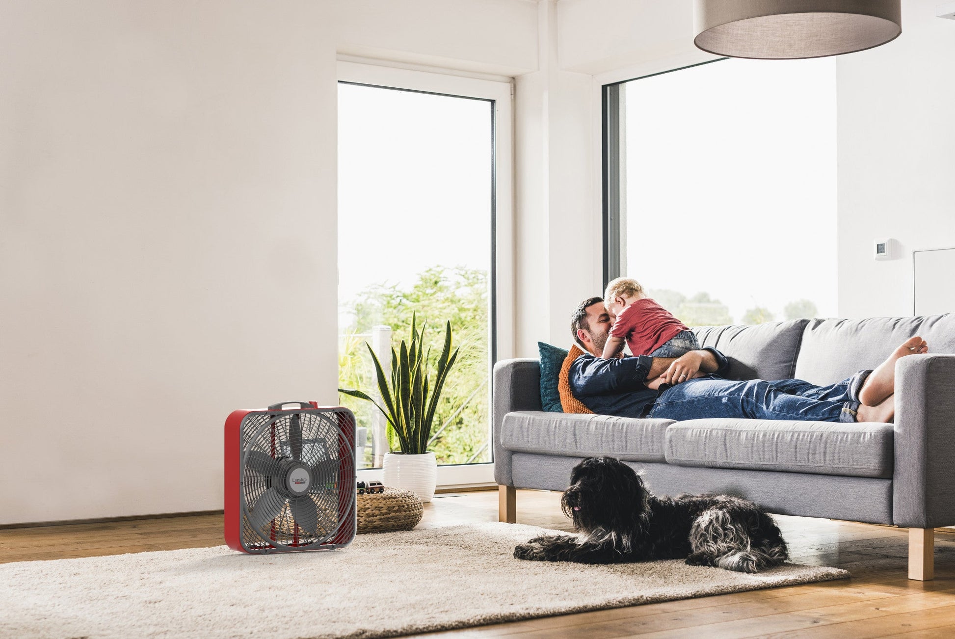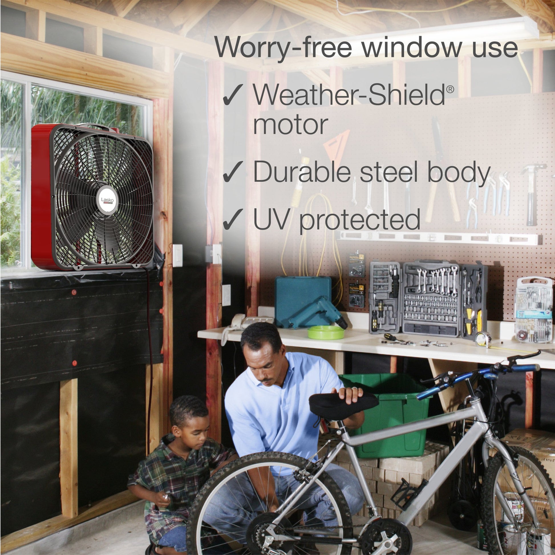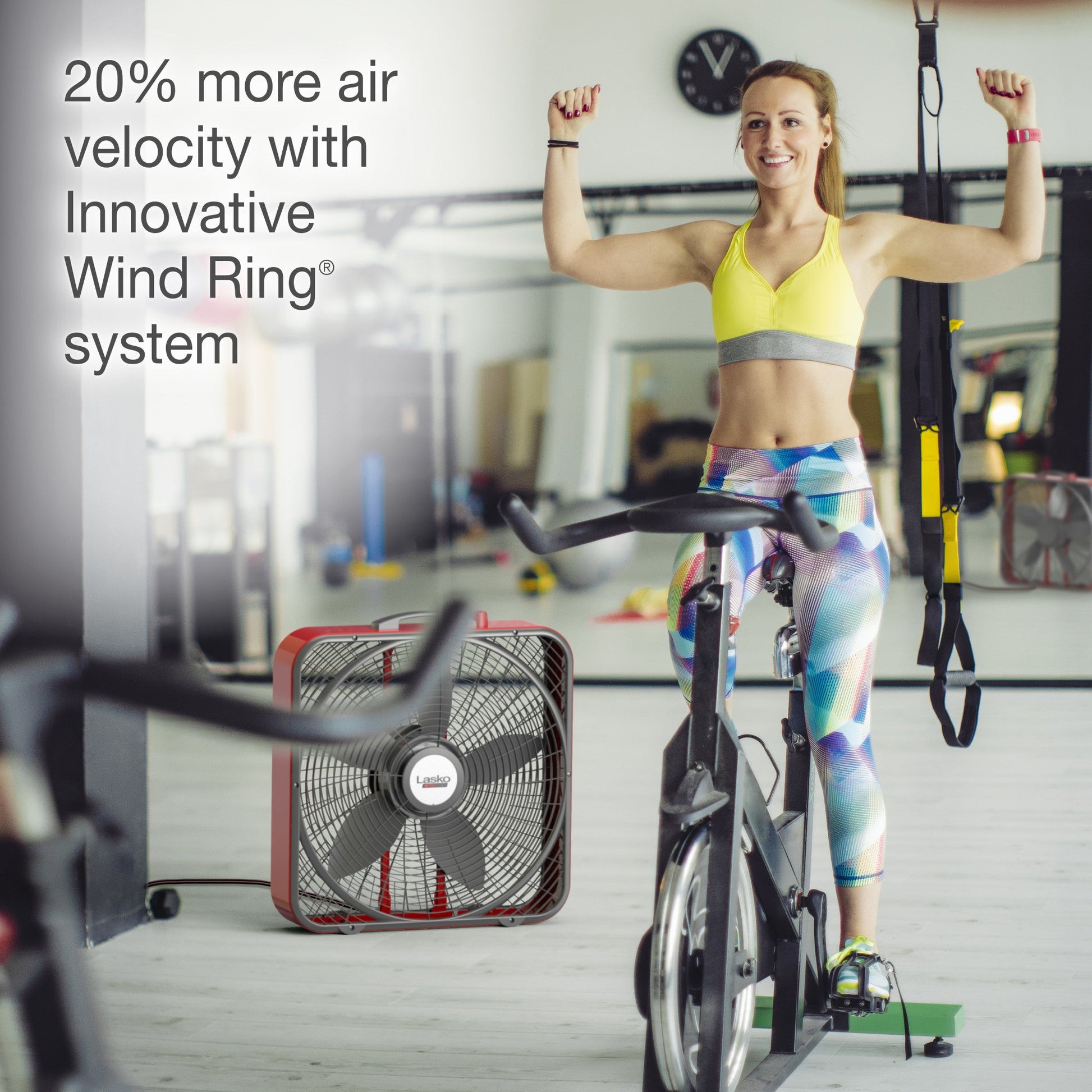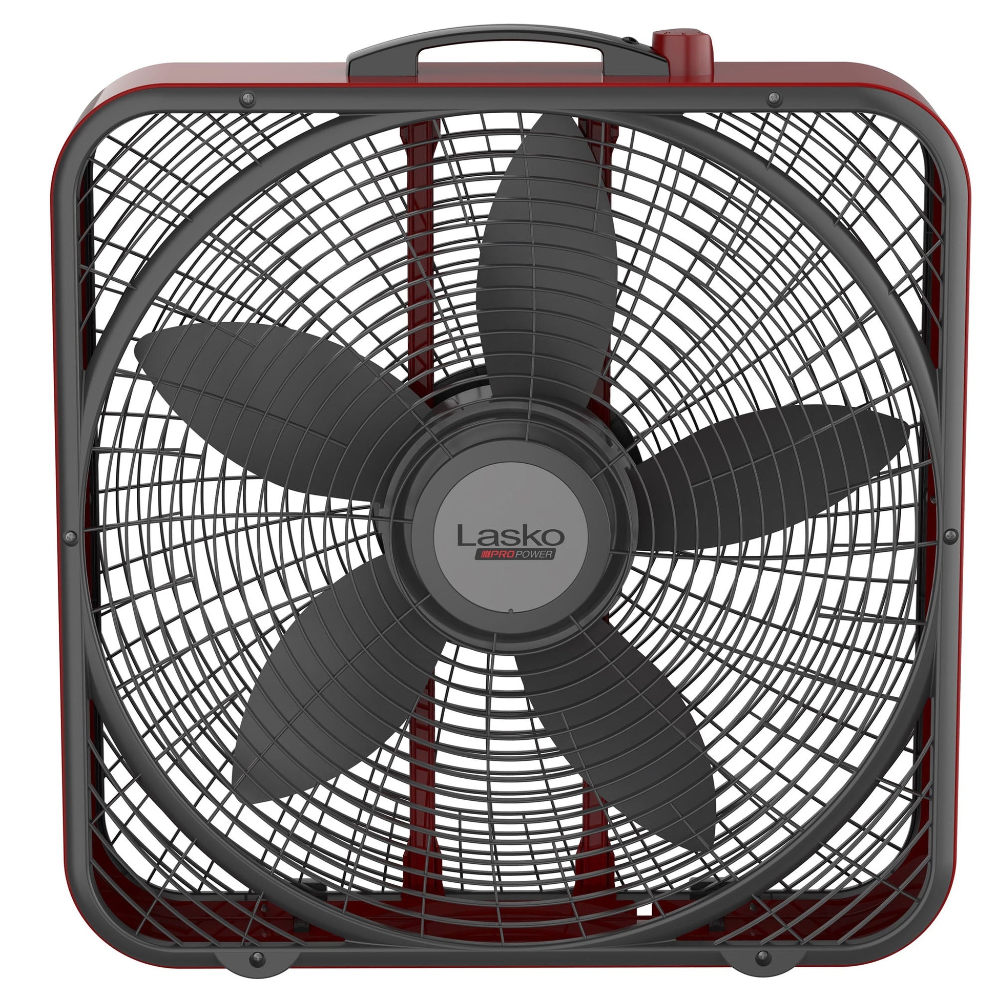 Enjoy outstanding air circulation with the Lasko Pro Power? 20-inch Box Fan. This powerful box fan features an innovative Wind Ring? system, that is engineered to provide up to 20% more air velocity. The wider, durable steel body allows for greater stability while the easy-carry handle makes portability a breeze. This fan features durable construction with over 25% more steel than the standard box fans. The patented Weather Shield? motor allows for worry-free window use. This box fan features simple top-mounted manual controls and 3 powerful speeds so you can customize your comfort. This fan is ideal fan for locations where extra durability and performance is needed such as workshops, garages, sheds and more. Use this box fan to circulate air conditioning, dispel stale air and odors, and bring fresh air in. Features Lasko¡¯s trusted, fused safety plug for peace of mind. Comes with Snap-on feet for added stability. Simple assembly required. Comes with a 2-year warranty.