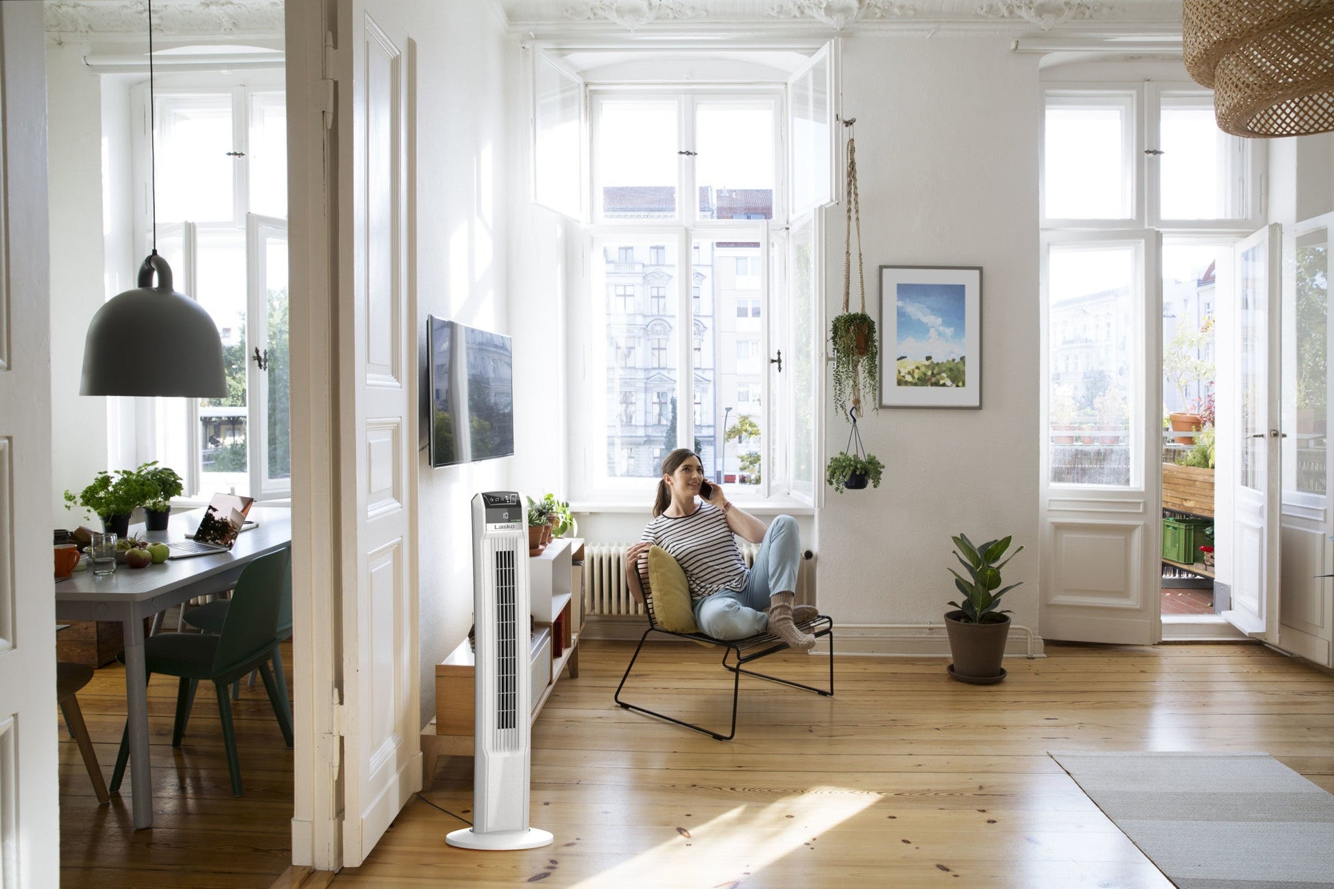 This 42" EcoQuiet DC Motor Tower Fan with remote control from Lasko features a sophisticated, space-saving design that blends beautifully into your home decor. This DC tower fan is over 60% more efficient than comparable AC tower fans. With whisper quiet operation, the New EcoQuiet fan is ideal for use in the bedroom, home office and main living areas or wherever you need air circulation. The quiet operation allows you to enjoy TV and provides white noise to lull you to sleep. This powerful tower fan features easy to use electronic controls with a digital display. Choose from 12 high performance speeds: 4 Turbo modes, 4 Breeze modes and 4 Whisper modes. Use the timer option to automatically turn the fan off after the selected time. The Nighttime setting will automatically decrease the speed and dim controls for a peaceful night¡¯s sleep. Features optional widespread oscillation for full-room coverage. The multi-function remote control operates all the fan function from a distance. Plus, there is storage for the remote on the back of the fan. The built-in carry handle makes it easy to move from room to room. Requires simple, no-tools assembly and comes with a 2-year limited warranty. Condition: New