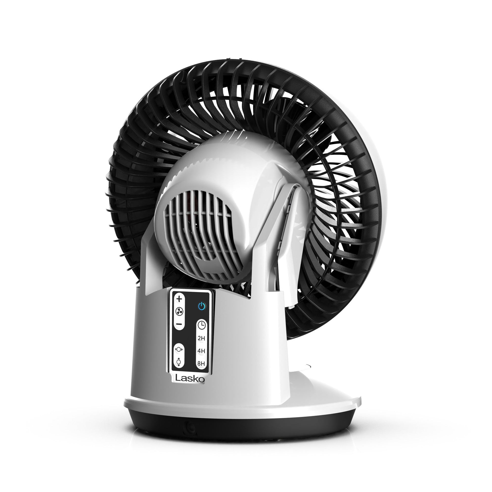 The Whirlwind A12557 White Orbital Motion Air Circulator with Remote Control from Lasko features orbital motion that is designed to oscillate vertically and horizontally or both simultaneously for maximum room coverage, features a 60¡ã horizontal swing, 90¡ã by 60¡ã orbital motion or 90¡ã vertical lift. This small but mighty fan will move air up to 1150 feet per minute and circulates the air up to 25.6 times per hour in a small room and 13.1 times per hour in medium sized rooms. Use the convenient comfort controls to select from 3 speeds ranging from quiet to powerful. The Dark Mode feature will automatically turn off the display lights after 5 seconds to create a more pleasant user experience. The multi-function remote control will operate this tabletop fan from a distance. Plus, there is storage for the remote on the back of the fan. Equipped with The Blue Plug, Lasko's Trusted Safety Fuse Technology. Come fully assembled with a 1-year limited warranty. Condition: New