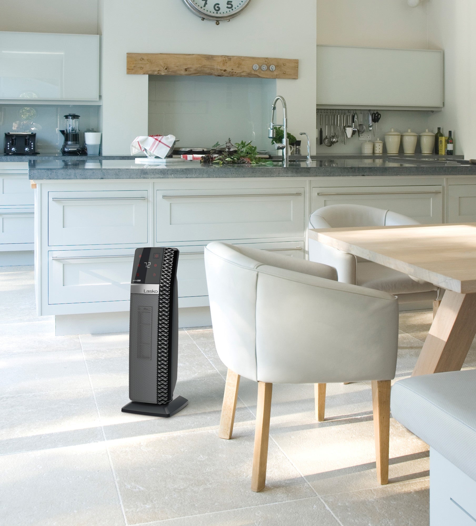 This Ceramic Tower Heater from Lasko's Elite Collection features simple digital controls with enhanced touch sensing capability, which makes operating your space heater easier than ever. With modern design details, this portable heater is ideal for living rooms, bedrooms, and other home spaces that need additional warmth. This heater quickly makes your rooms cozier and more comfortable with 25% wider oscillation and 1500 watts of heating power. Includes 3 heat settings, the Auto-Eco programmable thermostat, 8-hour auto shut-off timer, and an auto-dimming digital read-out. Built-in safety features include tip-over switch, overheat protection, and cool-touch housing. Includes a multi-function remote control, on-board remote storage, and built-in carry handle for portability. Comes fully assembled. 3-year limited warranty. Condition: New