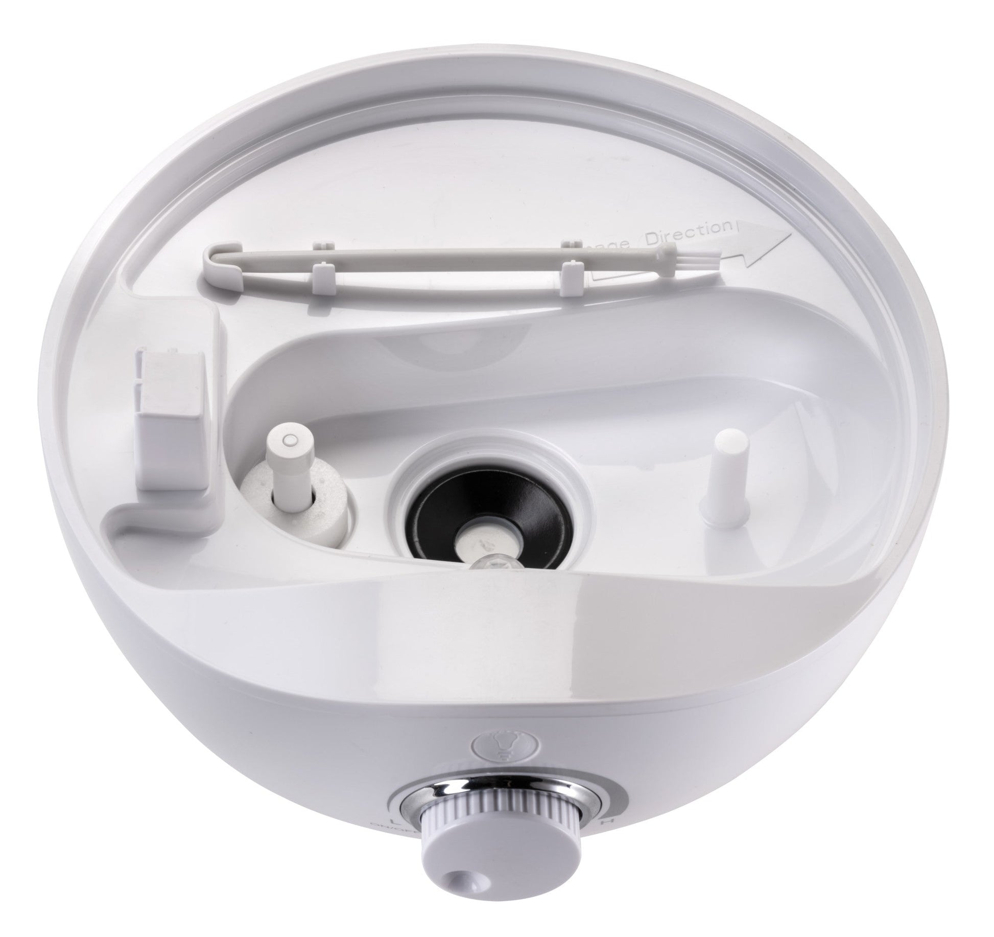 The Ultrasonic Cool Mist Humidifier from Lasko provides quiet, soothing humidity for your room. The cool mist nozzle is adjustable to 360-degrees. The removable tank holds 95 oz of water, so it will run up to 60 hours on the low setting. The adjustable mist control knob is simple to use and allows you to customize your room humidity level. Monitor your water supply through clear tank, then easily refill at sink or tub. The humidifier will automatically shut off when the tank is empty. Regular maintenance is a breeze because there are no filters to replace, plus the included cleaning brush can be stored conveniently right on the unit. Features a built-in scent tray for aromatherapy essential oils and a nightlight with 7 color choices to gently illuminate your room while you sleep. Comes fully assembled. Covers 300 square feet.